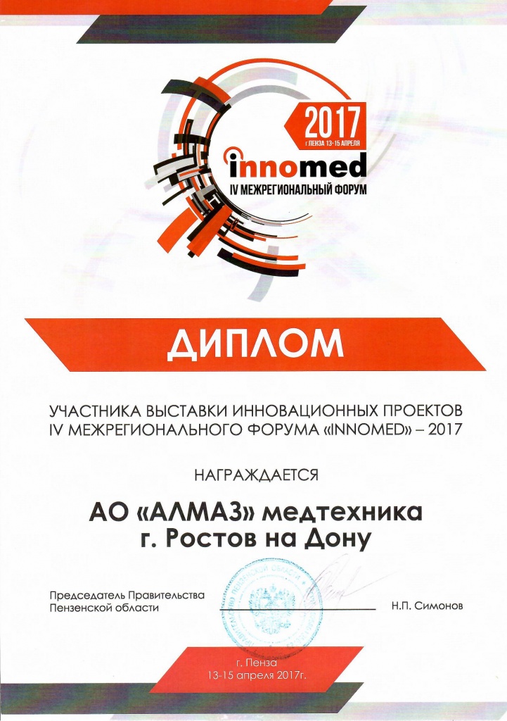 Диплом за участие в выставке международных проектов IV межрегионального форума INNOMED-2017 АО «Алмаз»